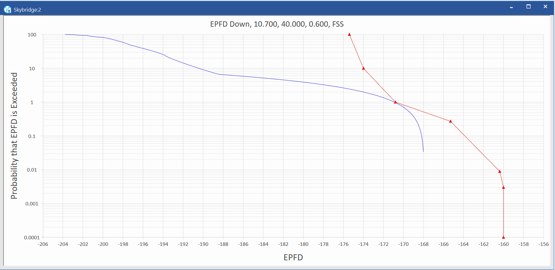 At the end of each run the CDF of EPFD is compared against the threshold in Article 22 of the RR to give a pass / fail decision. The EPFD CDF is in blue, the threshold in red.